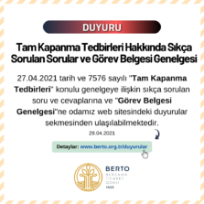 Tam Kapanma Tedbirleri ve Görev Belgesi Genelgesi Hk.